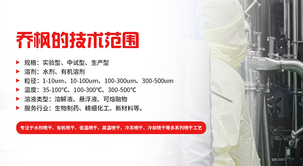 上海喬楓實業有限公司,成立于2012年,是從事粉體噴霧干燥機設備的研發、生產、銷售(小型噴霧干燥機,實驗型噴霧干燥機,氣流噴霧干燥機,有機溶劑噴霧干燥機,低溫噴霧干燥機,低溫閉式循環噴霧干燥機、噴霧造粒干燥機,離心噴霧干燥機,壓力噴霧干燥機中藥浸膏噴霧干燥機,沸騰制粒機等)和售后于一體的綜合性公司,本公司現成為一家致力于為新能源材料、精細化工、生物制藥以及食品工程等領域提供全套解決方案的整線交鑰匙工程企業。